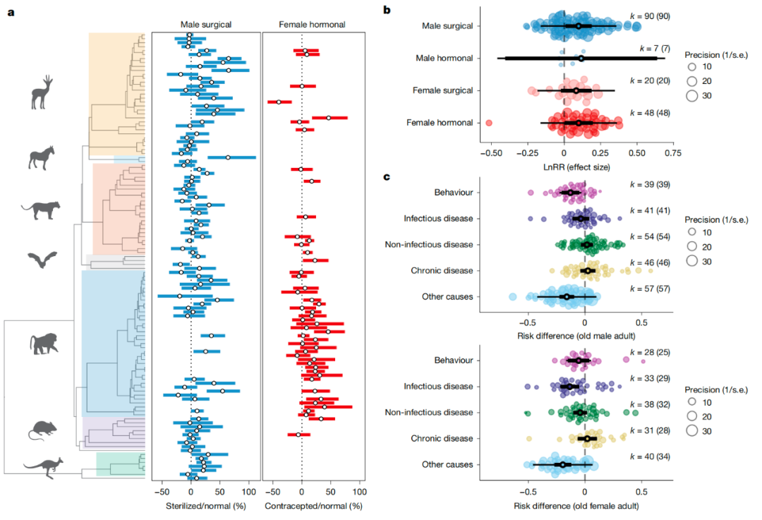 具体来说,抓续的激素避孕和永远性手术绝育与预期寿命延迟联系,这种效应在雄性和雌性动物中均存在,但两性受到保护免于特定死因的神气不同。雄性生计改善的笔据仅限于去势手术(阉割),且在芳华期前实践手术后果更权贵。对已发表数据的汇聚分析标明,绝育能栽种脊椎动物的生计率,并延迟去势啮齿动物的健康寿命。这种生计改善在实验室和野生环境中均存在,且不管雌性绝育神气是否切除卵巢齐有体现。而在历史上,被去势男性(古代阉东谈主)的生计率栽种与其他物种情况同样,而女性在永远性手术绝育青年计率略有着落(1%)。