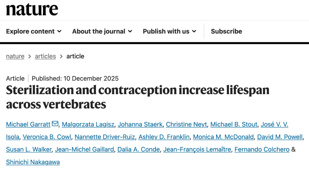 2025 年 12 月 10 日,海外大奖学术期刊Nature上发表了一年题为:Sterilization and contraception increase lifespan across vertebrates 的参谋论文。